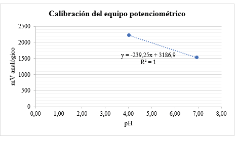 La linealidad del equipo potenciométrico se determinó a través de una regresión lineal, descrita a partir del promedio de pH calibrado durante los 30 días para cada una de las soluciones de referencia y los mV analógicos del equipo, tal como aparece en la tabla 2. Por otra parte, en la figura 2 se evidencia la curva y ecuación de calibración del equipo.