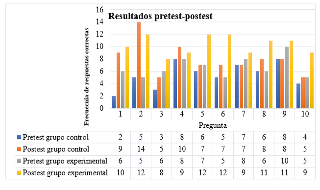 A continuación, en la figura 5 se muestra la frecuencia de respuestas correctas en el pretest y el postest para los grupos control y experimental; en esta se observa un incremento significativo en los resultados del grupo experimental después de la intervención.
