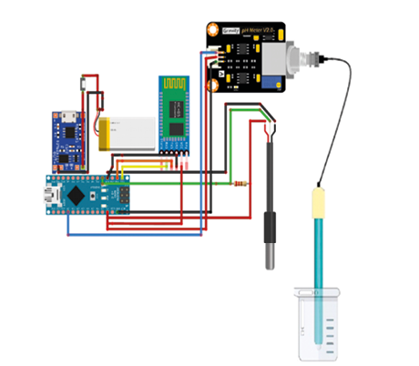 El equipo potenciométrico diseñado en esta investigación empleó un sensor analógico de pH DFRobot Gravity V2, un sensor de temperatura sumergible DS18B20, una resistencia de 4,7Ω, un módulo de carga Tp4056 USB Tipo C, una batería de litio recargable de 3,7v 1000 mAh, una unidad de microcontrolador Arduino nano V.3, un módulo Bluetooth HC-05, cables jumpers macho-hembra y macho-macho, baquelita e hilo de estaño. Las conexiones fueron soldadas de acuerdo a la siguiente figura: