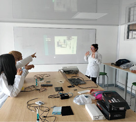 Para el caso del grupo experimental, además de realizar una sesión teórica sobre los temas abordados también con el grupo de control, se realizó un taller práctico, donde los estudiantes tuvieron la posibilidad de construir de manera grupal el hardware de un equipo potenciométrico y tomaron medidas con el equipo potenciométrico central de esta investigación. Las actividades prácticas con los estudiantes del grupo experimental, facilitaron la motivación por aprender conceptos asociados a otras ciencias como la ingeniería, la tecnología o la programación, ya que estas no han sido abordadas durante su formación académica. En la figura 4 se evidencia el trabajo práctico abordado con los estudiantes del grupo experimental.